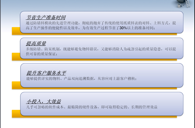 - 3、看板及PDA向导式备料作业;实现备料防错;